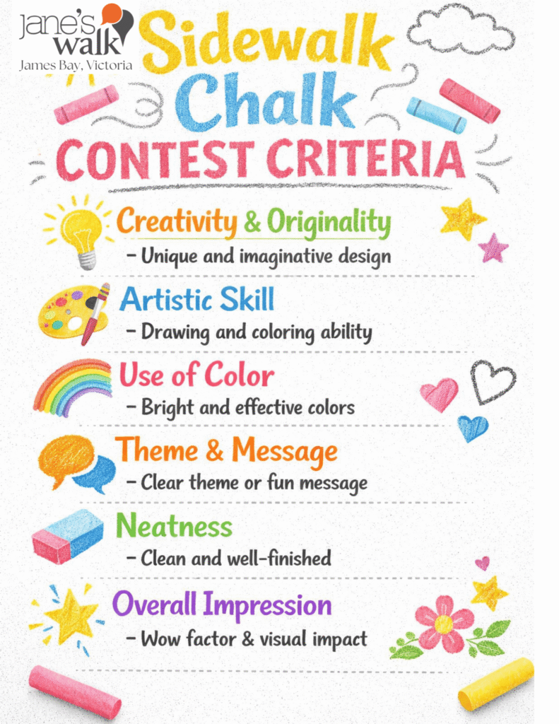 Jane’s Walk James Bay invites artists of all ages and skill levels to create a vibrant, temporary works of chalk art during our inaugural Jane’s Walk Sidewalk Chalk Art Contest. This community event brings together creativity, colour, and friendly competition for a day of outdoor art-making. Bring your own chalk or stop by at For Good Measure to pick some up on Saturday, May 2 and Sunday, May 3 from 11:00 am – 2:00 pm. While you’re welcome to chalk it up just for fun, if you want to enter the contest for prizes, please see below.